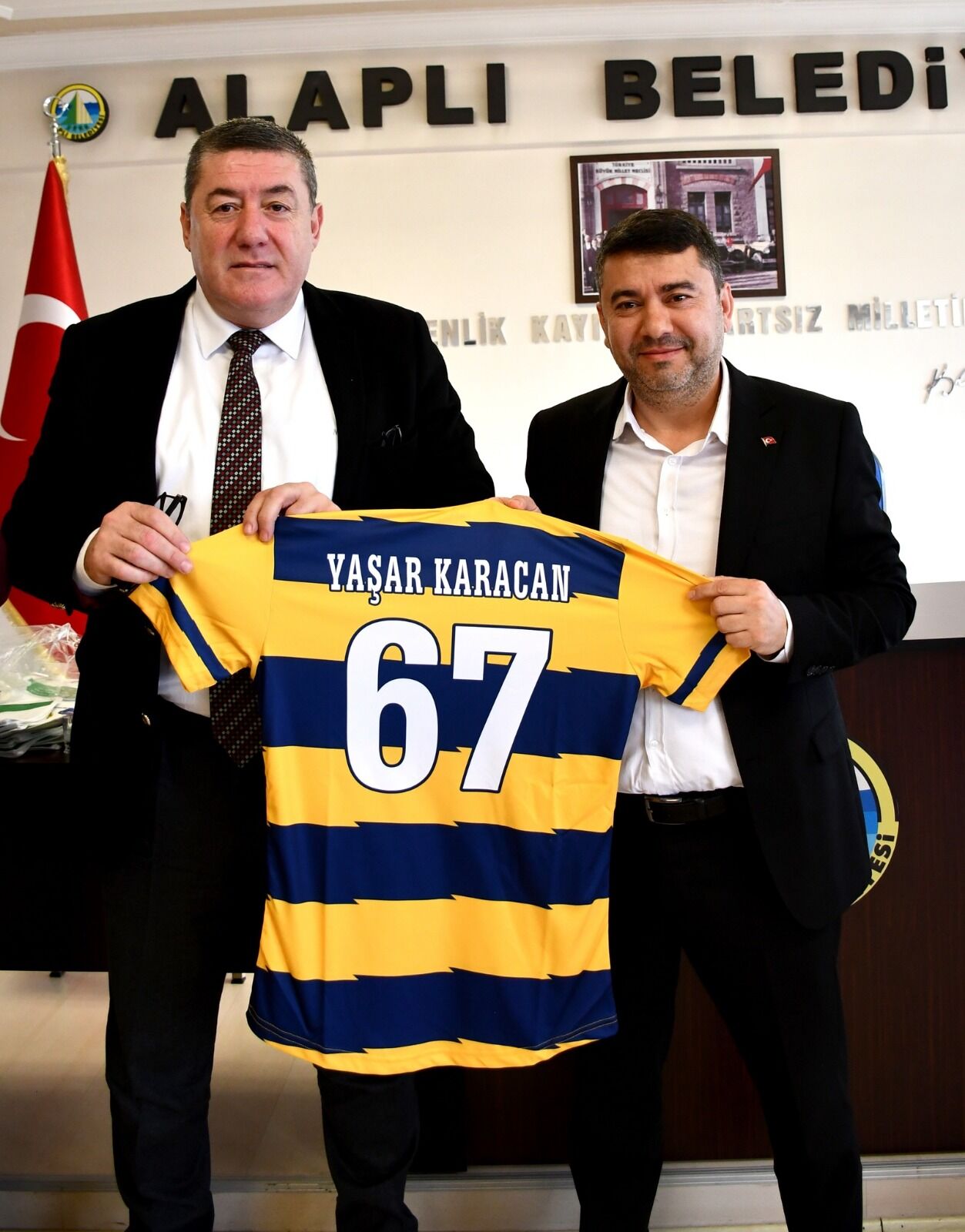 Toplantı öncesinde Alaplı Belediye Başkanı Nuri Tekin, CHP ve AK Parti’li Belediye Meclis üyelerine isimleri yazılı 67 numaralı Alaplı Belediyespor forması hediye etti.