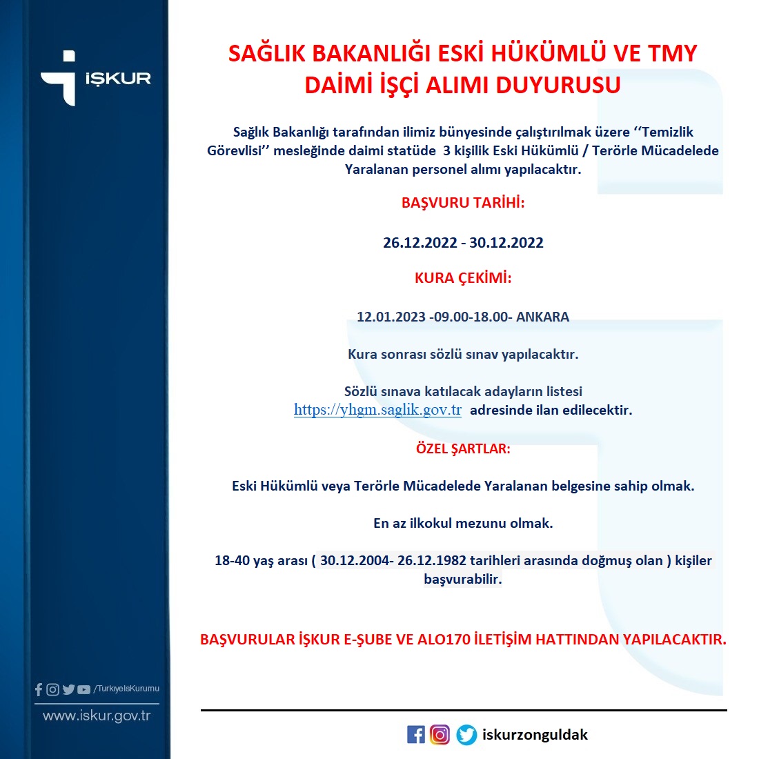 İş Kur’dan yayınlanan ilana göre Sağlık Bakanlığı işçi alımına yalnızca Eski Hükümlü veya Terörle Mücadelede Yaralanan (TMY) statüsünde kaydı olan adaylar başvuru yapabilecek.