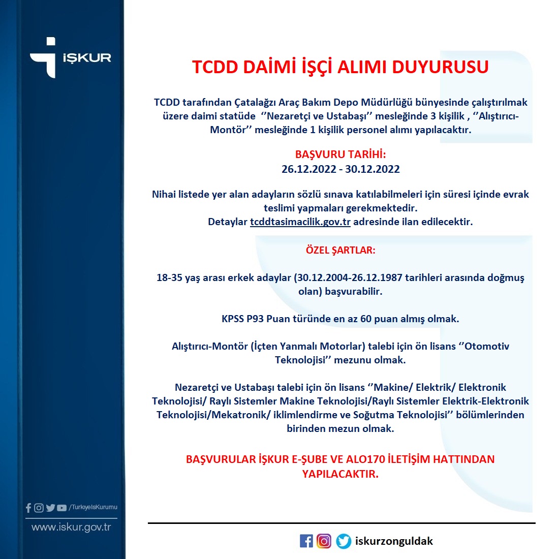 Ayrıca İş-Kur’dan yapılan duyuruda TCDD Çatalağzı Araç Bakım Depo Müdürlüğü bünyesinde görev yapmak üzere Nezaretçi ve Ustabaşı Mesleğinde 3 kişilik, Alıştırıcı-Montör mesleğinde 1 kişilik daimi işçi alımı yapılacağı da ifade edildi.