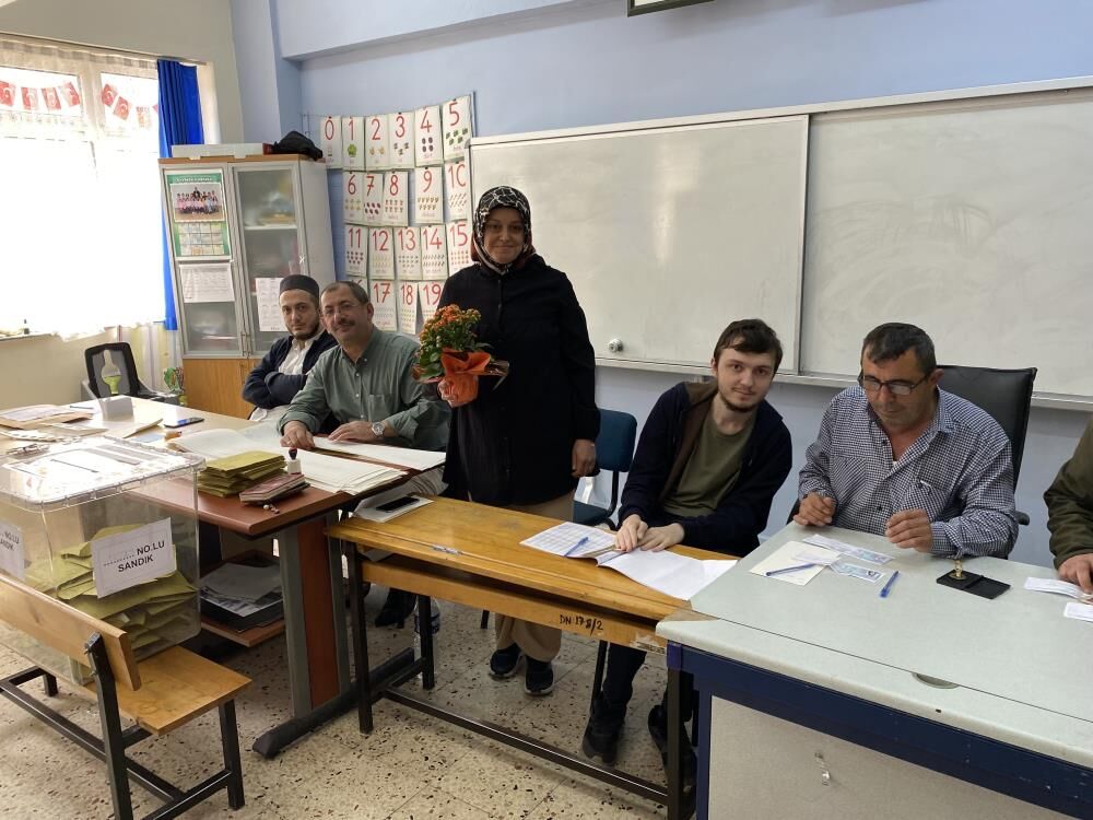 Sandık başında görevli olduğu sırada ellerinde çiçeklerle salona giren çocuklarını gören anneleri Uçar’ın anneler gününü tebrik etti.