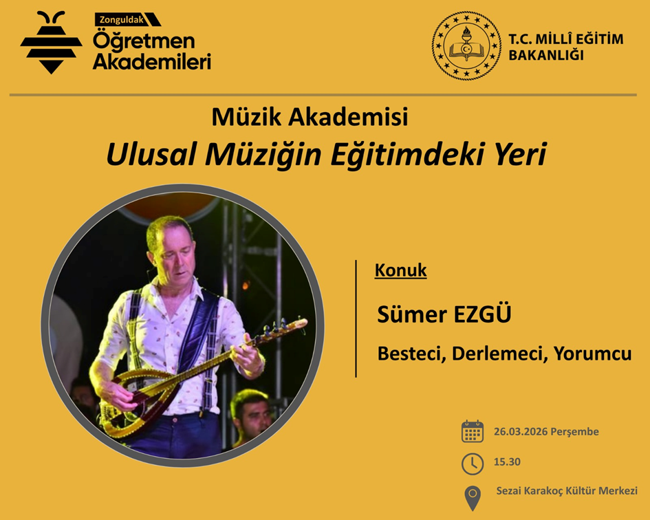 Millî Eğitim Bakanlığı himayelerinde ve Zonguldak İl Millî Eğitim Müdürlüğü koordinesinde yürütülen Öğretmen Akademileri programlarının 2025-2026 eğitim öğretim yılı bahar dönemi açılışı, ünlü TRT sanatçısı, besteci, derlemeci ve yorumcu Sümer Ezgü’nün katılımıyla gerçekleştirilecek.