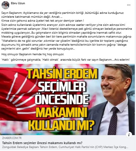 “Göreve geldiğiniz günden bu yana partimizin mahalle sorumlularını makamınıza çağırıp ‘Mahallenizde ne gibi sorunlar var, çözelim’ dediğinizi hiç duymadık. Ama yakın zamanda bazı mahalle temsilcilerimizin çağrılarak ‘delege seçimlerini alın, gelin’ talimatı verildiği her yerde konuşuluyor. Hoş olmuyor Başkanım, hem de hiç hoş olmuyor.”