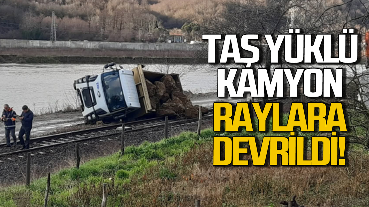 Zonguldak’ın Çaycuma ilçesine bağlı Aşağı Sarmaşık Köyü Yolcuoğlu Mahallesi’nde meydana gelen kazada, kaya kütleleri taşıyan bir kamyon tren raylarının üzerine devrildi. Olay nedeniyle demiryolu ulaşımı bir süre aksadı.