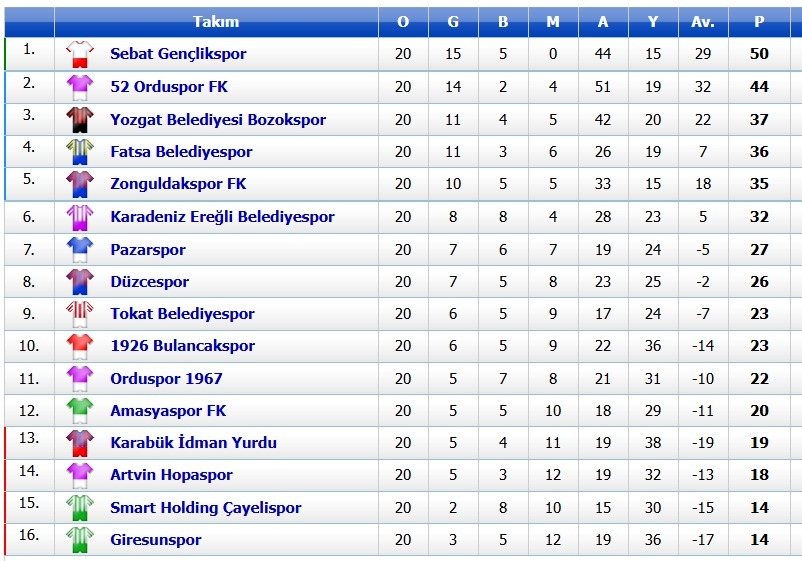 Şampiyonluk ve play-off mücadelesi veren 6 takımdan Sebat Gençlikspor 50 puanla namağlup liderliğini sürdürüyor. 52 Orduspor 44 puanla 2., Yozgat Belediye Bozokspor 37 puanla 3., Fatsa Belediyespor 36 puanla 4., temsilcimiz Zonguldakspor 35 puanla 5. bir değer temsilcimiz Kdz. Ereğli Belediyespor’da 32 puanla 6. sırada yer alıyor. İLK 6’da olan lider Sebat Gençlikspor ve 52 Orduspor haftayı galibiyetle kapatırken, temsilcilerimiz Zonguldakspor ve Kdz. Ereğli Belediyespor başta olmak üzere Yozgat Belediye Bozokspor ve Fatsa Belediyespor’da mağlup oldu.