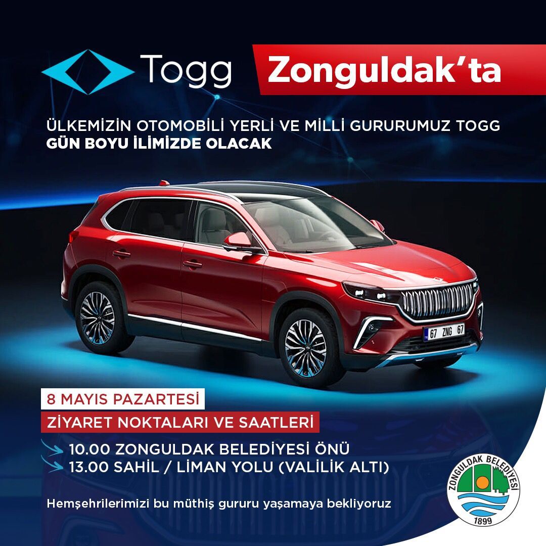 Türkiye’nin yerli otomobili TOGG Zonguldak’ta. Farklı illerde caddelere çıkan TOGG 8 Nisan Pazartesi günü Zonguldak’ta olacak. Bartın ve Karabük’te vatandaşların yakından görmek için ilgi gösterdiği TOGG saat 10.00 Zonguldak Belediyesi önünde saat 13.00’ten itibaren ise Zonguldak Valiliği sahil bandında sergilenecek. Zonguldak Belediyesi tarafından yapılan duyuruda vatandaşlar aracı görmeye davet edildi.