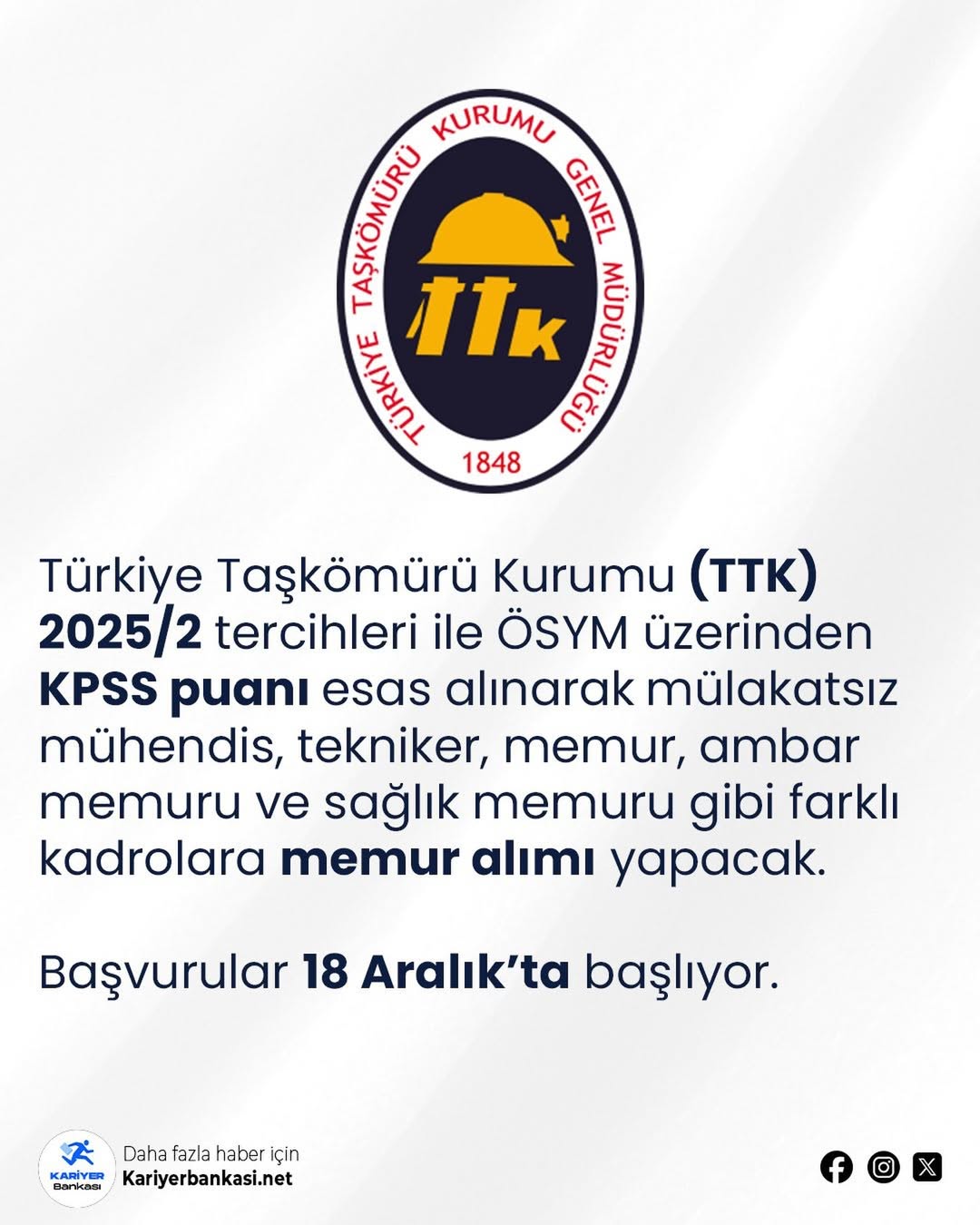 Türkiye Taşkömürü Kurumu (TTK) 2025/2 tercihleri ile ÖSYM üzerinden KPSS puanı esas alınarak mülakatsız mühendis, tekniker, memur, ambar memuru ve sağlık memuru gibi farklı kadrolara memur alımı yapacak. Başvuruların 18 Aralık tarihinde başlayacağı belirtildi.