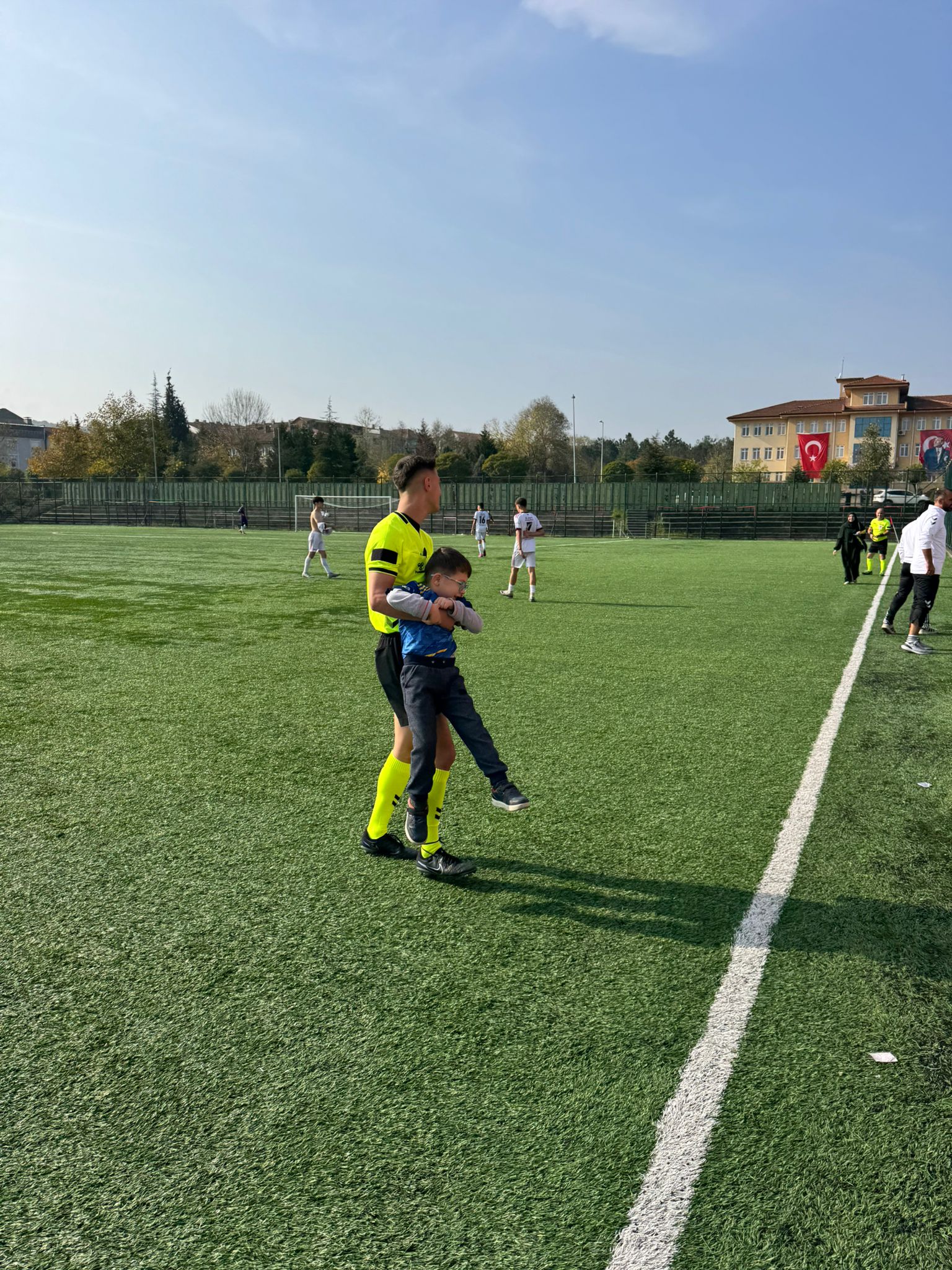 Çaycumaspor formasıyla sahaya giren minik taraftarın, futbolcu olan abisini aramak için sahaya girdiği öğrenildi. Hakem ve futbolcuların tebessümle karşıladığı bu sürpriz ziyaret, saha kenarında bulunan izleyicilere de keyifli anlar yaşattı.
