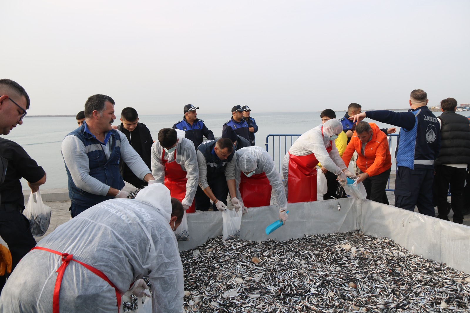 Belediye Başkanı Halil Posbıyık, eşi Kadın Gücü Kooperatifi Başkanı Neriman Posbıyık, oğlu Tuğberk Posbıyık, CHP İlçe Başkanı Zerrin Yılmaz Erdoğan ve yönetimi, belediye başkan yardımcıları ve meclis üyeleriyle birlikte alana gelerek 10 bin ton hamsinin ücretsiz olarak halka dağıtılmasına start verdi.