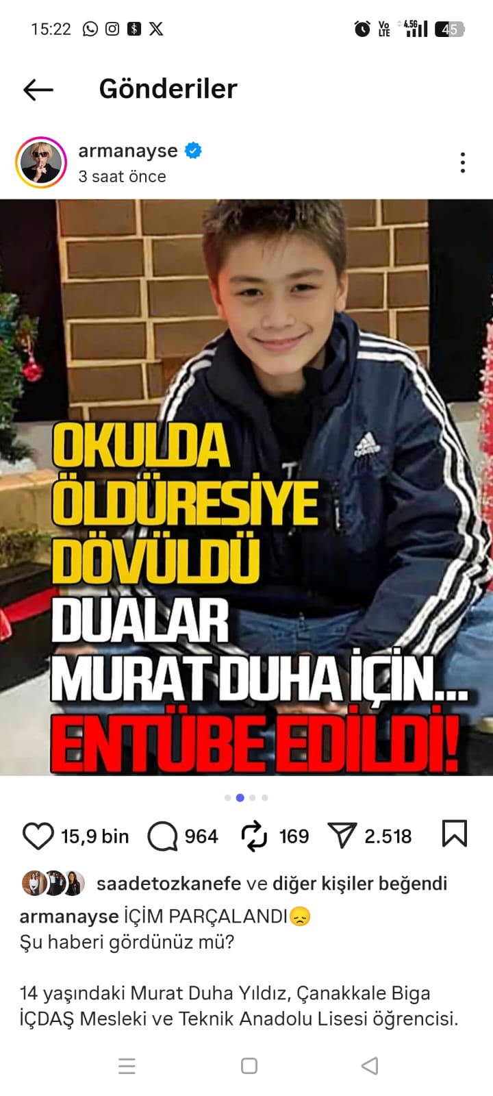 Milyonlarca insan Z HABER’in ve alıntılanan diğer gönderilerin altına cinayete varan akran zorbalıklarına tepkilerini dile getirerek yoğun bakımdaki Murat Duha için dua ettiler.