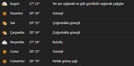 Pazar günü sıcaklık 27 dereceye kadar çıkarken, akşam saatlerinde kısa süreli serinleme hissedilecek. Yağışların yerel olarak etkili olması ve kısa süreli gök gürültüleriyle birlikte görülmesi bekleniyor.