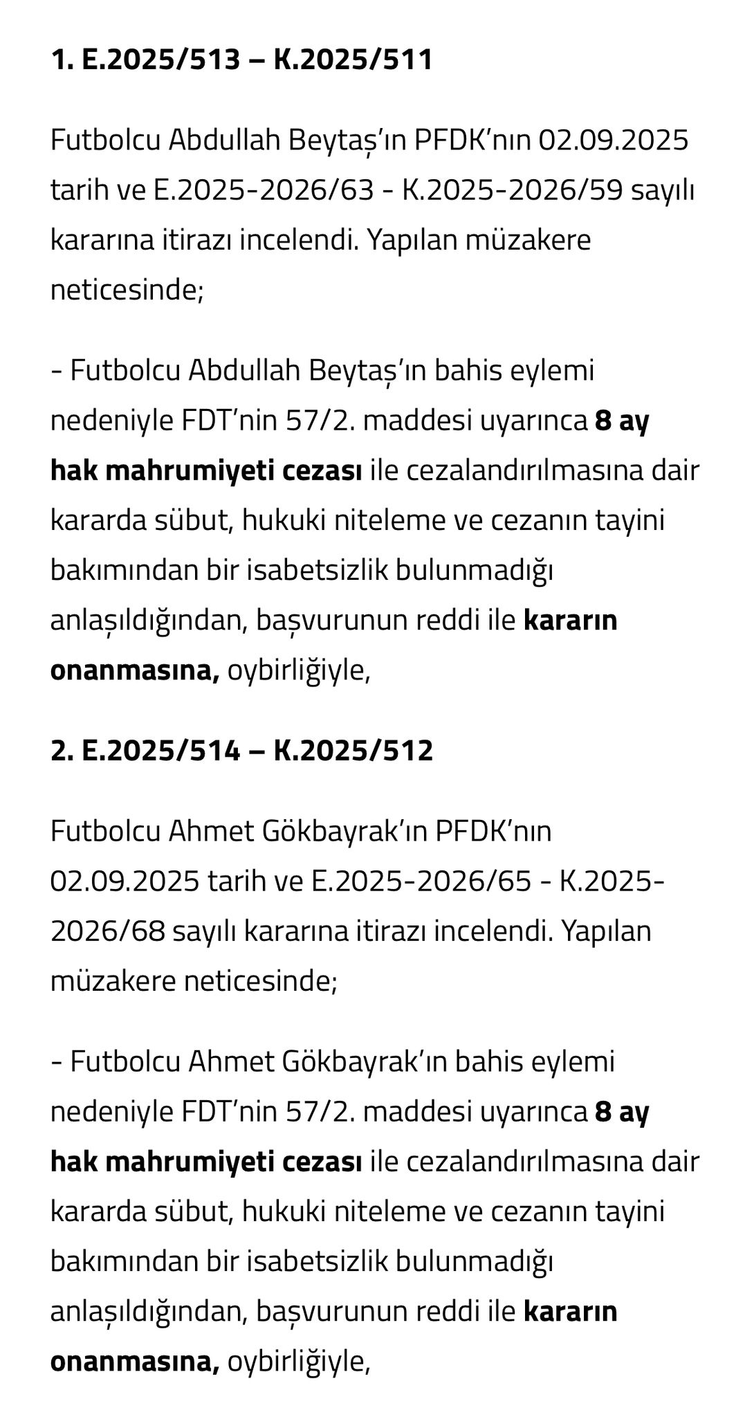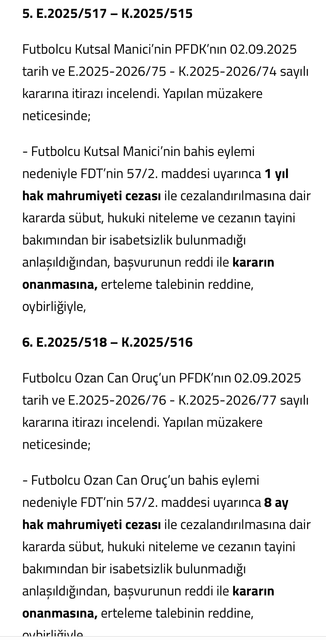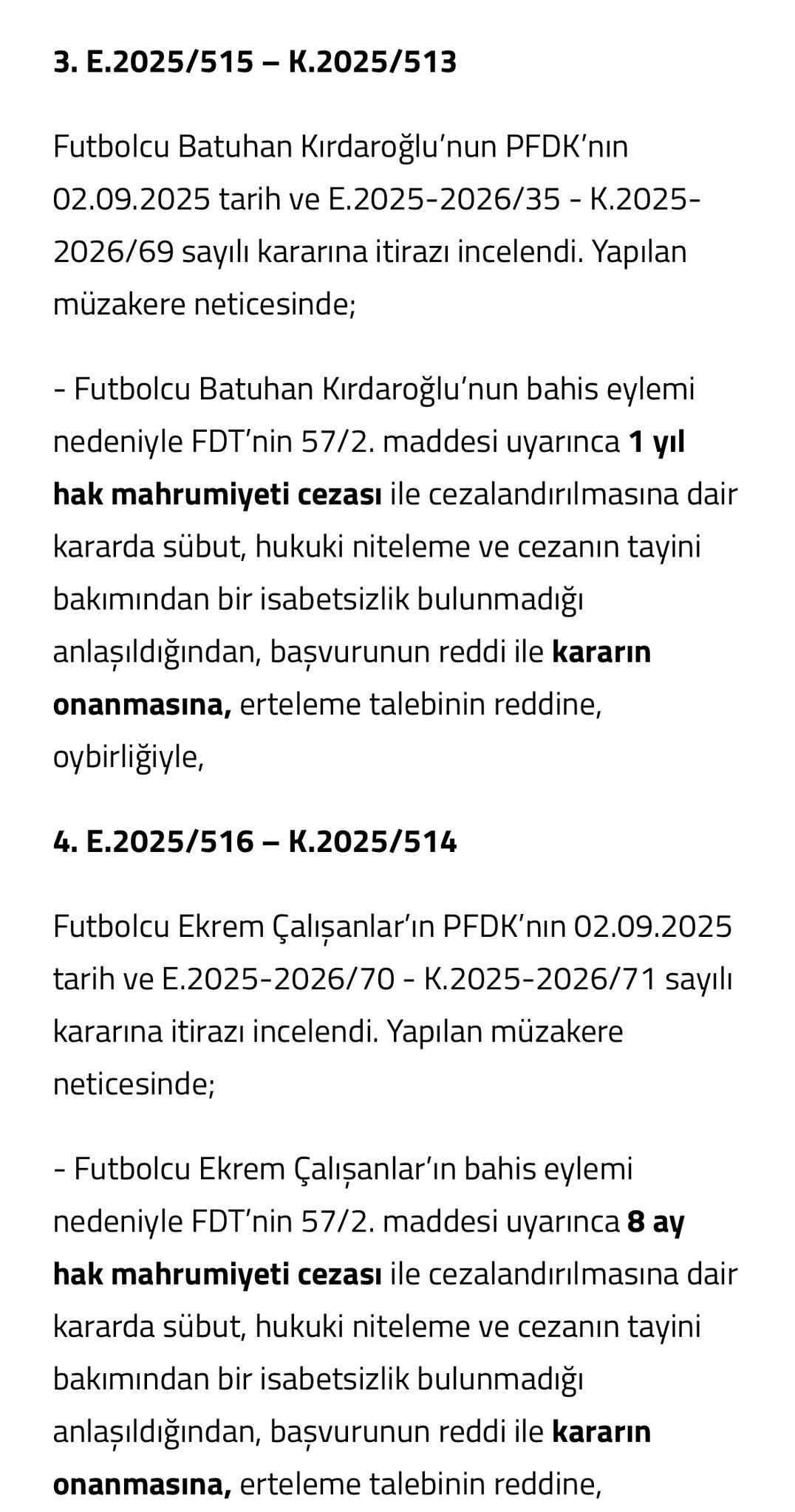 2023-2024 sezonunda 2. Lig Beyaz Grup’ta oynanan Ankaraspor–Nazilli Belediyespor karşılaşması, iki takımın da şut çekmeden golsüz berabere bitmesiyle büyük tartışma yaratmıştı. CHP Genel Başkan Yardımcısı ve Zonguldak Milletvekili Deniz Yavuzyılmaz, maçtaki şaibeye dikkat çekerek, şike iddiasını ülke gündemine taşımış, Zonguldak Spor yönetimi ve kamuoyunun tepkileri sonrası TFF maçı şike şüphesiyle incelemeye almıştı. TFF Hukuk Müşavirliği, Ankaraspor ve Nazillispor kulüpleriyle birlikte toplam 54 kişiyi, müsabakanın sonucuna etki etmek ve bahis oynamak gerekçesiyle PFDK’ya sevk etmişti. PFDK, 2 Eylül 2025 tarihinde gerçekleştirdiği toplantıda, 27 futbolcuya men cezası verdi. Tahkim Kurulu ise 10 Eylül 2025’te, ilgili kulüp başkanları, teknik sorumlular ve futbolcuların yaptığı itirazları reddetti; cezaların hukuka uygun şekilde verildiğine hükmederek bahis eylemi nedeniyle daha öncesinde verilen cezaları onadı.