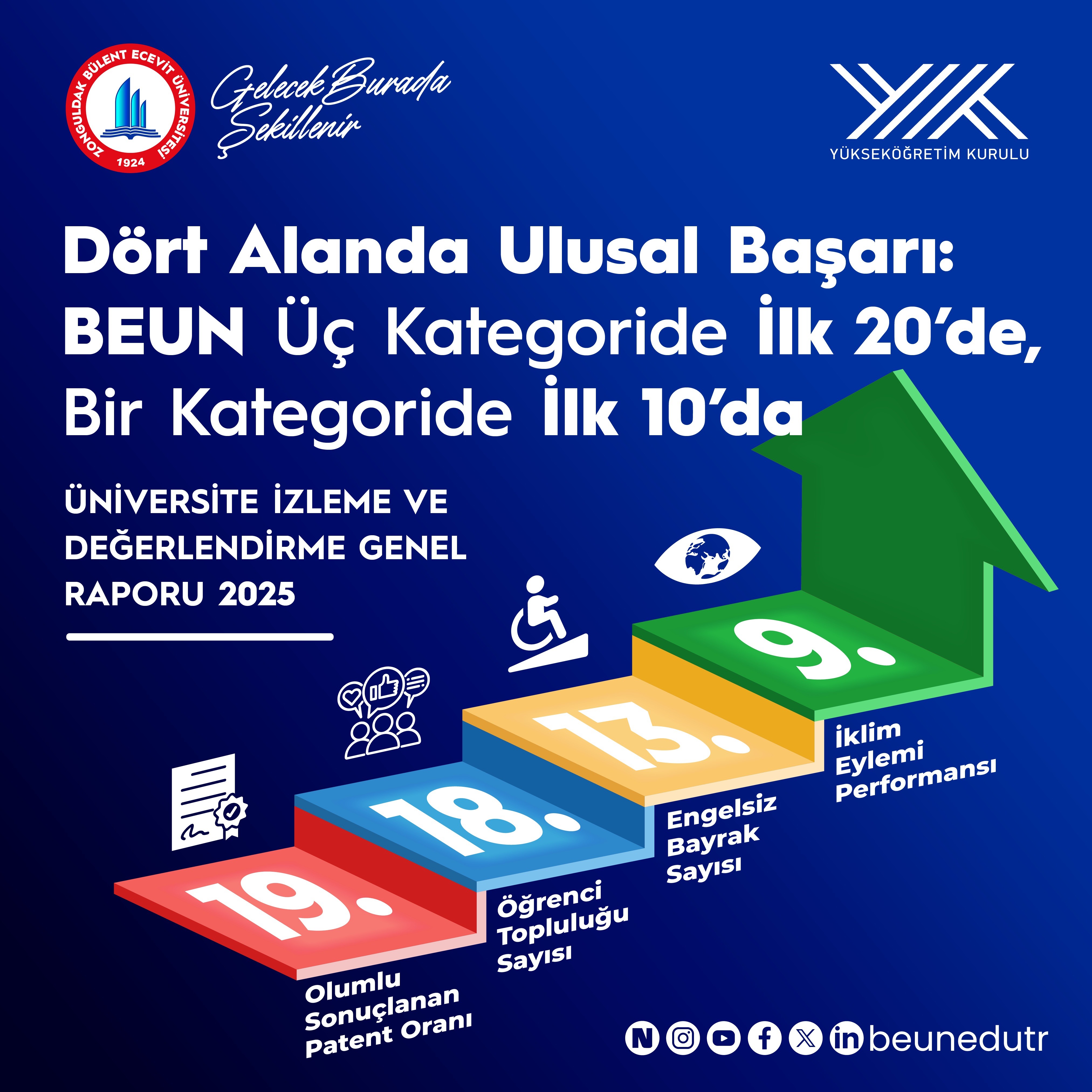 Zonguldak Bülent Ecevit Üniversitesi (BEUN), Yükseköğretim Kurulu (YÖK) tarafından yayımlanan "Üniversite İzleme ve Değerlendirme Genel Raporu-2025" sonuçlarına göre birçok alanda gösterdiği üstün performansla Türkiye genelinde dikkat çekici bir başarıya imza attı.