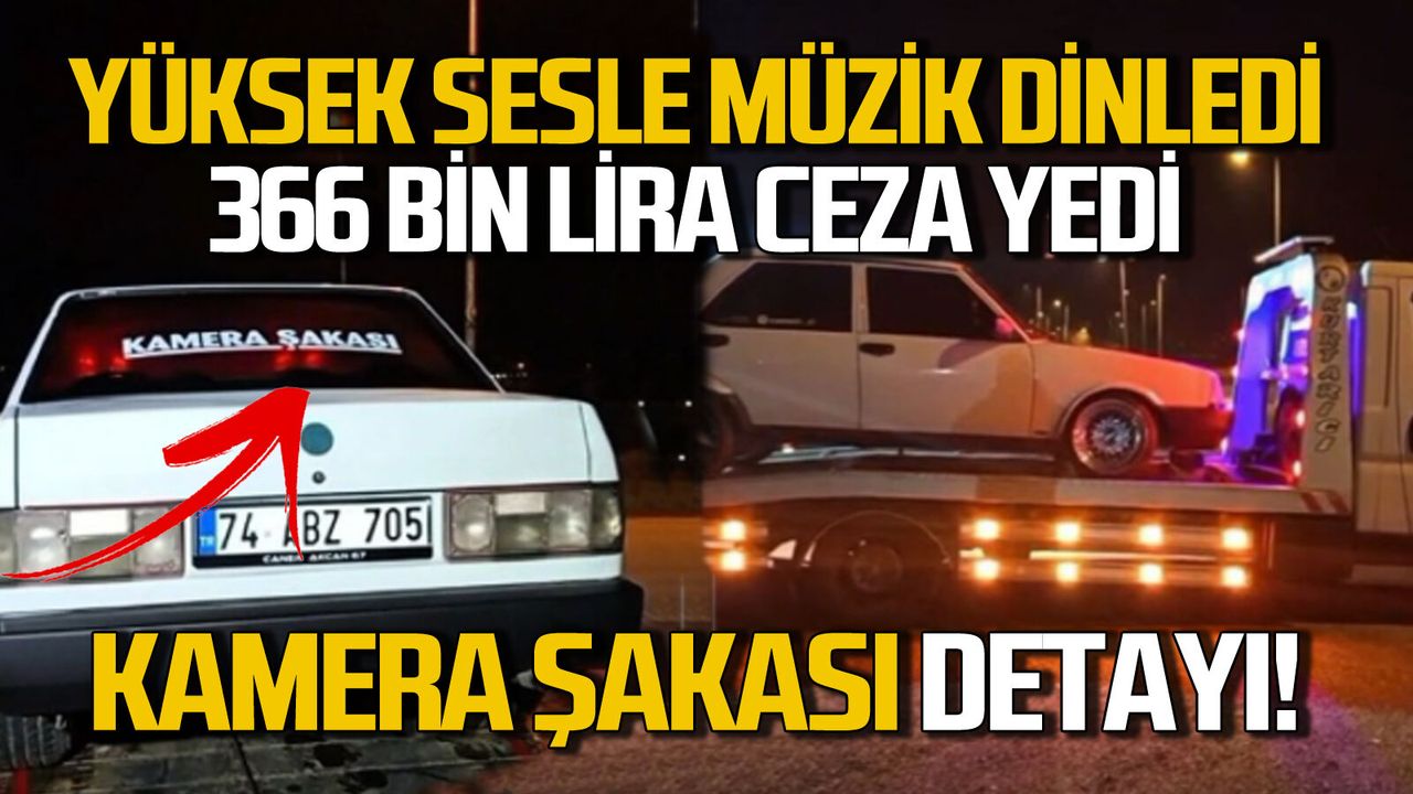 Yüksek sesle müzik dinlediği için 366 bin lira para cezasına çarptırılan sürücünün kullandığı aracın arka camında “Kamera Şakası” yazısı dikkatlerden kaçmadı.
