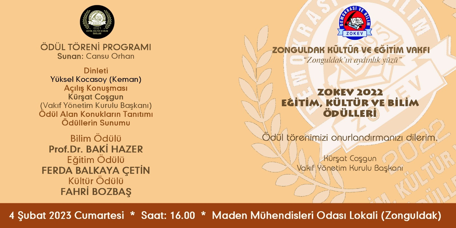 Zonguldak Kültür ve Eğitim Vakfı (ZOKEV) tarafından her yıl bilim, kültür ve eğitim dalında verilen ödüller belli oldu. Vakıftan yapılan açıklamaya göre, 2022 yılı ödülleri, bilim dalında Prof. Dr. Baki Hazer’e, eğitim alanında Ferda Balkaya Çetin’e, kültür alanındaysa Fahri Bozbaş’a verildi. Ödül töreni 4 Şubat Cumartesi günü, 16.00’da Maden Mühendisleri Odası Zonguldak Şubesinde yapılacak. ZOKEV Başkanı Kürşat Coşgun’un bir açılış konuşması yapacağı törende Yüksel Kocasoy kemanıyla bir dinleti de sunacak. Açıklamada ödül gerekçeleri şöyle açıklandı: