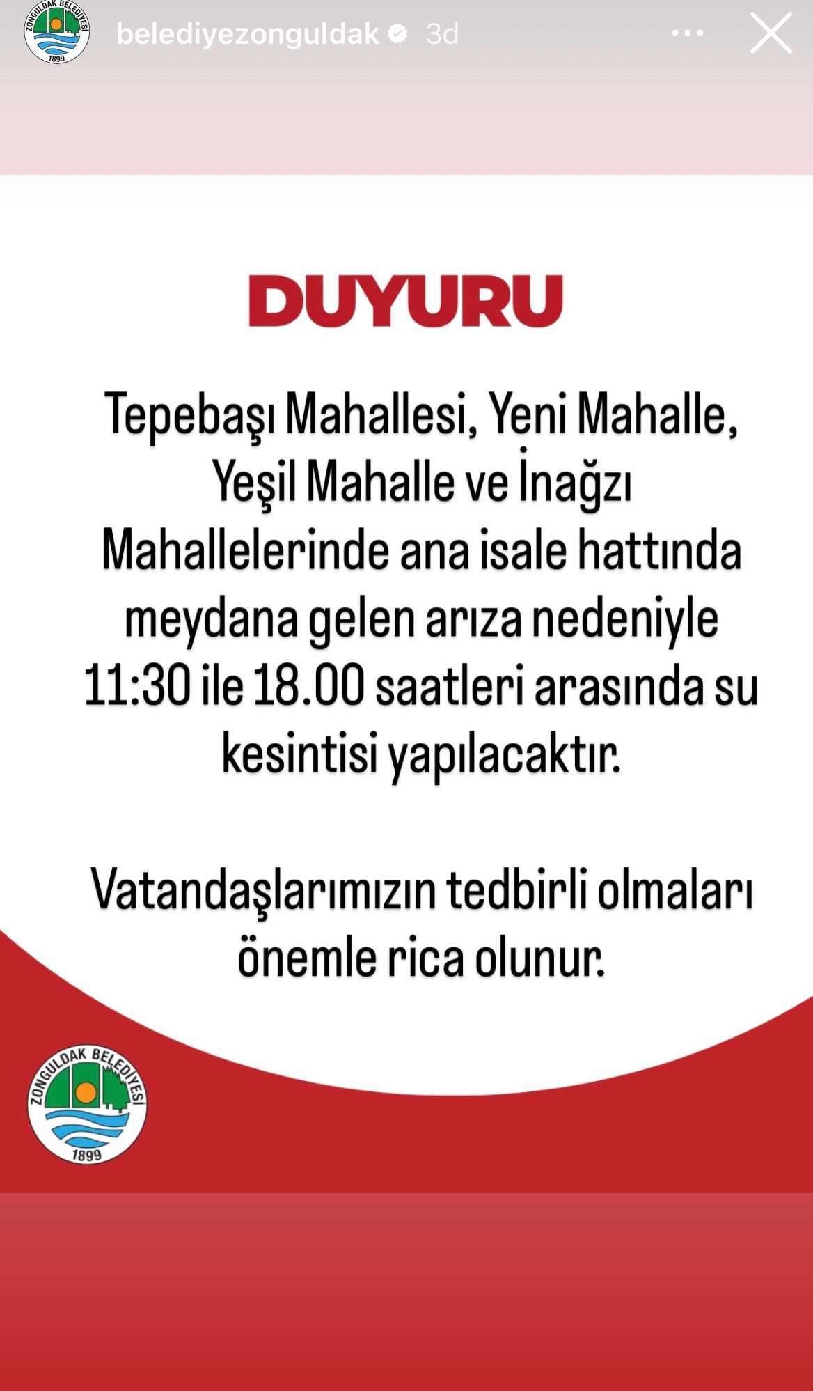 Zonguldak Belediyesi, Tepebaşı Mahallesi, Yeni Mahalle, Yeşil Mahalle ve İnağzı Mahallelerinde ana isale hattında meydana gelen arıza nedeniyle saat 11.30- 18.00'da su kesintisi yaşanacağını duyurdu.