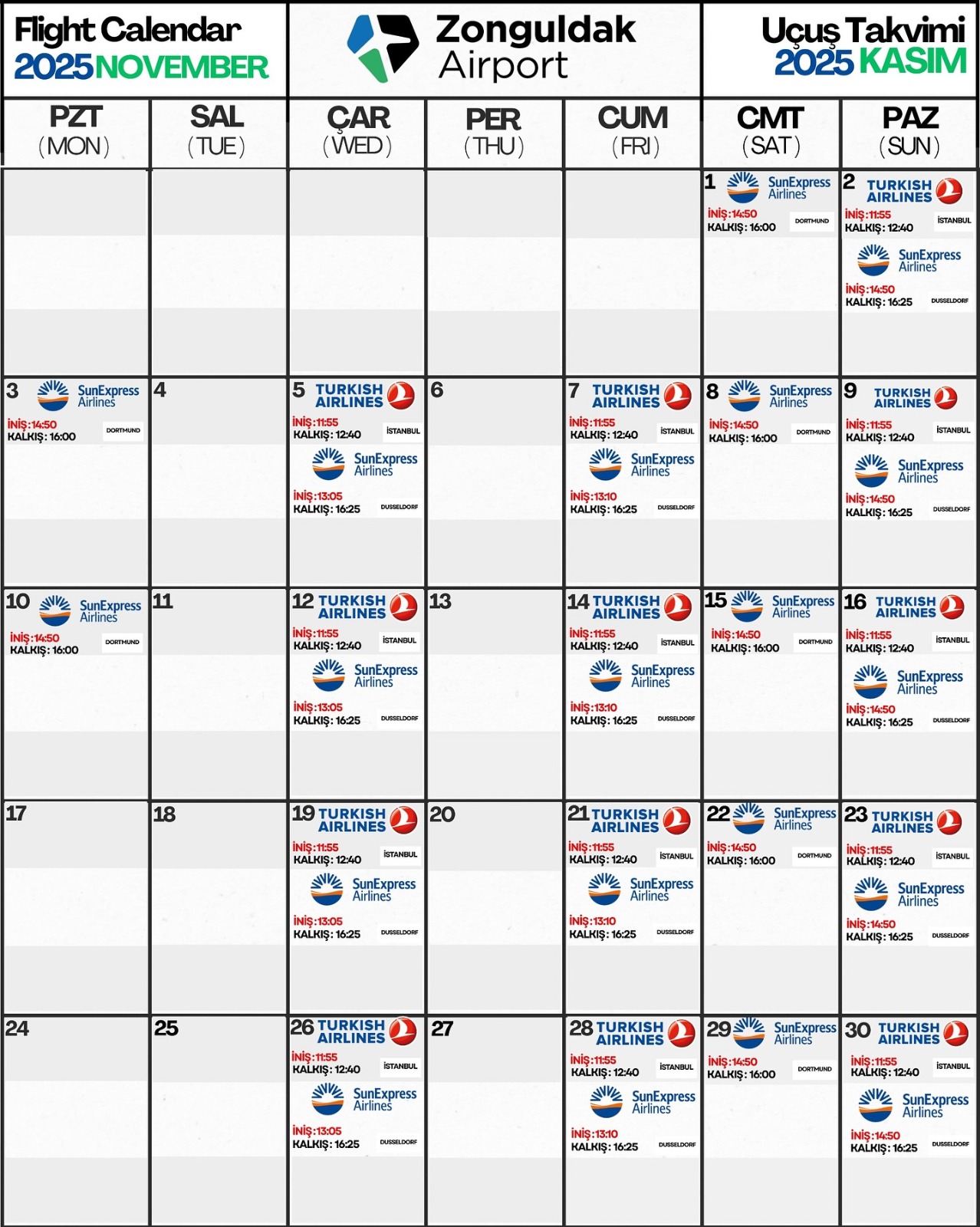 Zonguldak Havalimanı, THY –SUNEXPRESS Havayolları'nın Kasım ayında yapılacak uçuş programını açıkladı. YURT İÇİ VE YURT DIŞI UÇUŞ TAKVİMİ ŞU ŞEKİLDE: