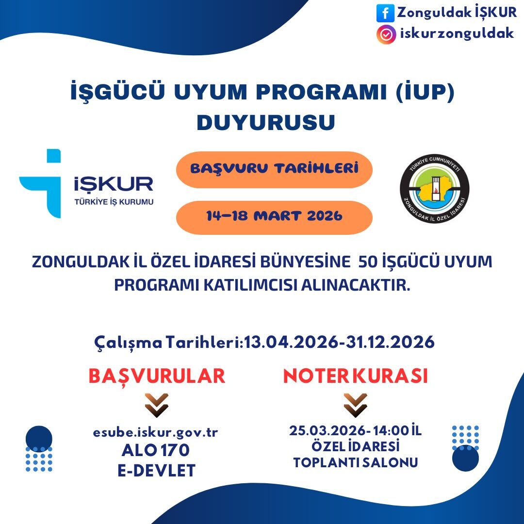 Zonguldak İl Özel İdaresi bünyesine çalıştırılmak üzere İşgücü Uyum Programı kapsamında 50 personel alınacak. Başvuruların 14-18 Mart tarihlerinde yapılacağı belirtildi.