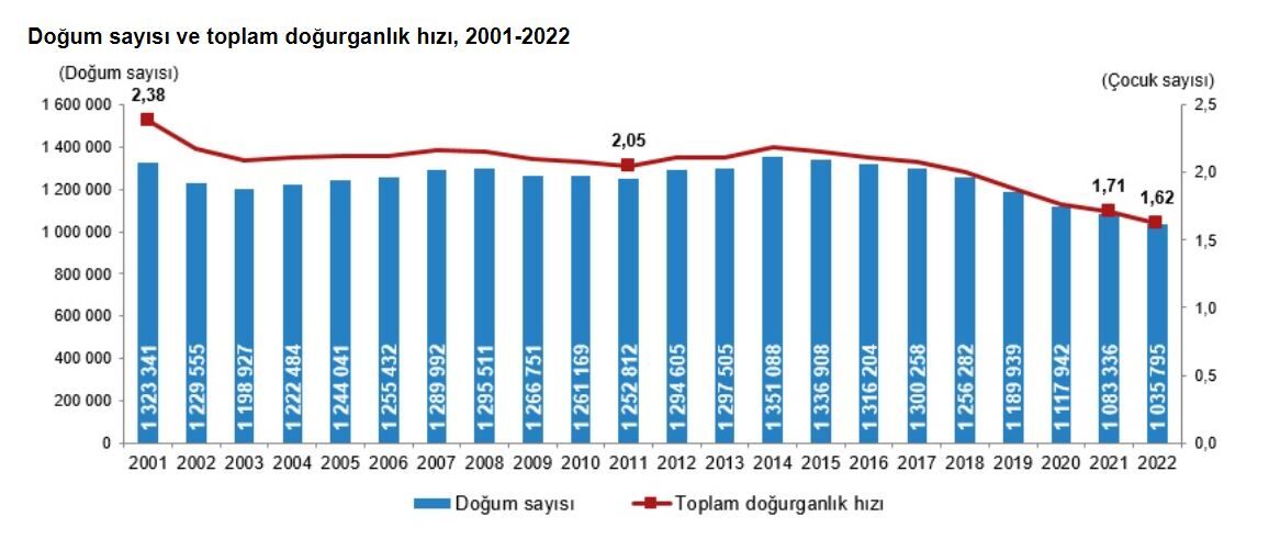 Türkiye İstatistik Kurumu (TÜİK), 2022 yılına ilişkin doğum istatistiklerini açıkladı. Buna göre; 2022 yılında 1 milyon 35 bin 795 bebek doğumu gerçekleşti. Bebeklerin yüzde 51,4'ü erkek, yüzde 48,6'sı kız oldu. 15-49 yaş grubundaki bir kadının doğurabileceği ortalama çocuk sayısını ifade eden toplam doğurganlık hızı; 2001 yılında 2,38 çocukken; 2022 yılında 1,62 çocuk olarak gerçekleşti.
