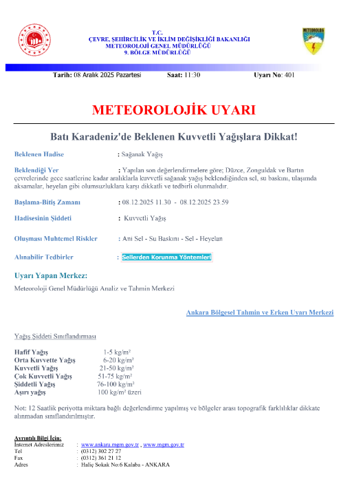 Meteoroloji Genel Müdürlüğü Analiz ve Tahmin Merkezi’nden yapılan açıklama şöyle: “Yapılan son değerlendirmelere göre; Düzce, Zonguldak ve Bartın çevrelerinde gece saatlerine kadar aralıklarla kuvvetli sağanak yağış beklendiğinden sel, su baskını, ulaşımda aksamalar, heyelan gibi olumsuzluklara karşı dikkatli ve tedbirli olunmalıdır.