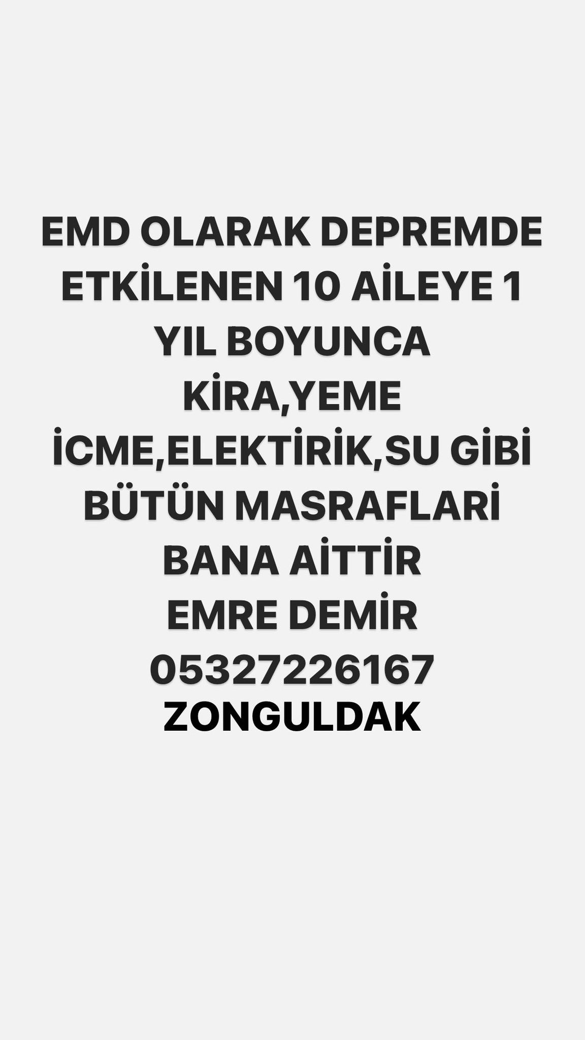 Zonguldaklı genç iş insanı Emre Demir deprem sonrası yaşanan acılara ve ihtiyaçlara duyarsız kalmadı. Emre Demir depremden etkilenen 10 ailenin bir yıl boyunca konaklama ve tüm ihtiyaçlarını karşılamak istediğini paylaştı. Emre Demir yaptığı paylaşımda numarasını da yazarak ihtiyaç sahibi ailelerin kendisine ulaşmasını istedi. Emre Demir’in bu çağrısının pek çok imkan sahibine örnek olması bekleniyor.