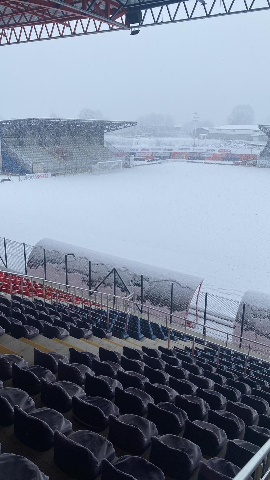 Düzce Şehir Stadyumu’nda sabah saatlerinden itibaren etkisini artıran yoğun kar yağışı, saha zemininin oynanamaz hale gelmesine neden oldu. Maç öncesi yapılan saha incelemesinin ardından hakem triosu müsabakanın ertelenmesine karar verdi.