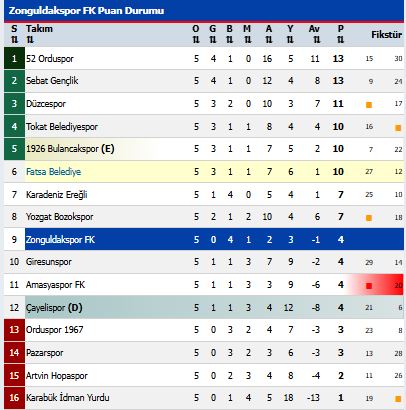 13.sıradaki Orduspor ve 14.sıradaki Pazarspor’un 3’er puanları bulunurken, 15. sıradaki Artvin Hopaspor’un 2 puanı, 16.sıradaki Karabük İdman Yurduspor’da 1 puanı bulunuyor.