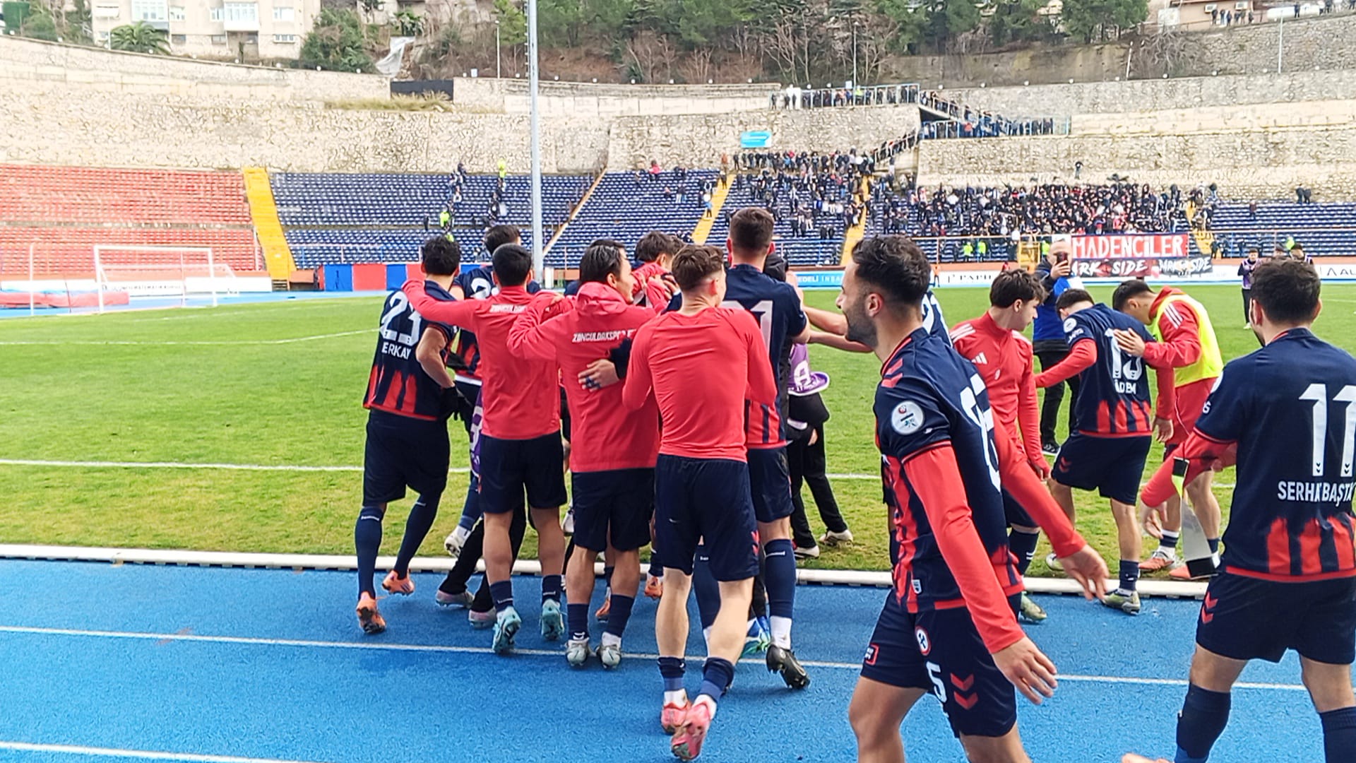 Maçın bitiş düdüğüyle birlikte Zonguldaksporlu futbolcular, 3-0’lık derbi galibiyetinin sevincini tribünleri dolduran taraftarlarla birlikte doyasıya yaşadı.