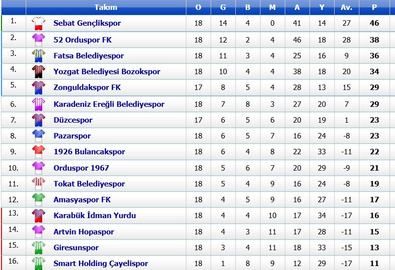 Temsilcilerimiz Zonguldakspor ve Kdz. Ereğli Belediyespor başta olmak üzere 52 Orduspor FK, 1926 Bulancakspor, Sebat Gençlikspor, Karabük İdman Yurduspor 18. haftayı galibiyetle kapatırken Smart Holding Çayelispor, Artvin Hopaspor, Giresunspor, Yozgat Belediyesi Bozokspor, Fatsa Belediyespor, Düzcespor haftayı yenilgi ile kapattılar. Amasyaspor FK, Tokat Belediyespor, Orduspor 1967, Pazarspor ise haftayı 1’er puanla kapattılar.