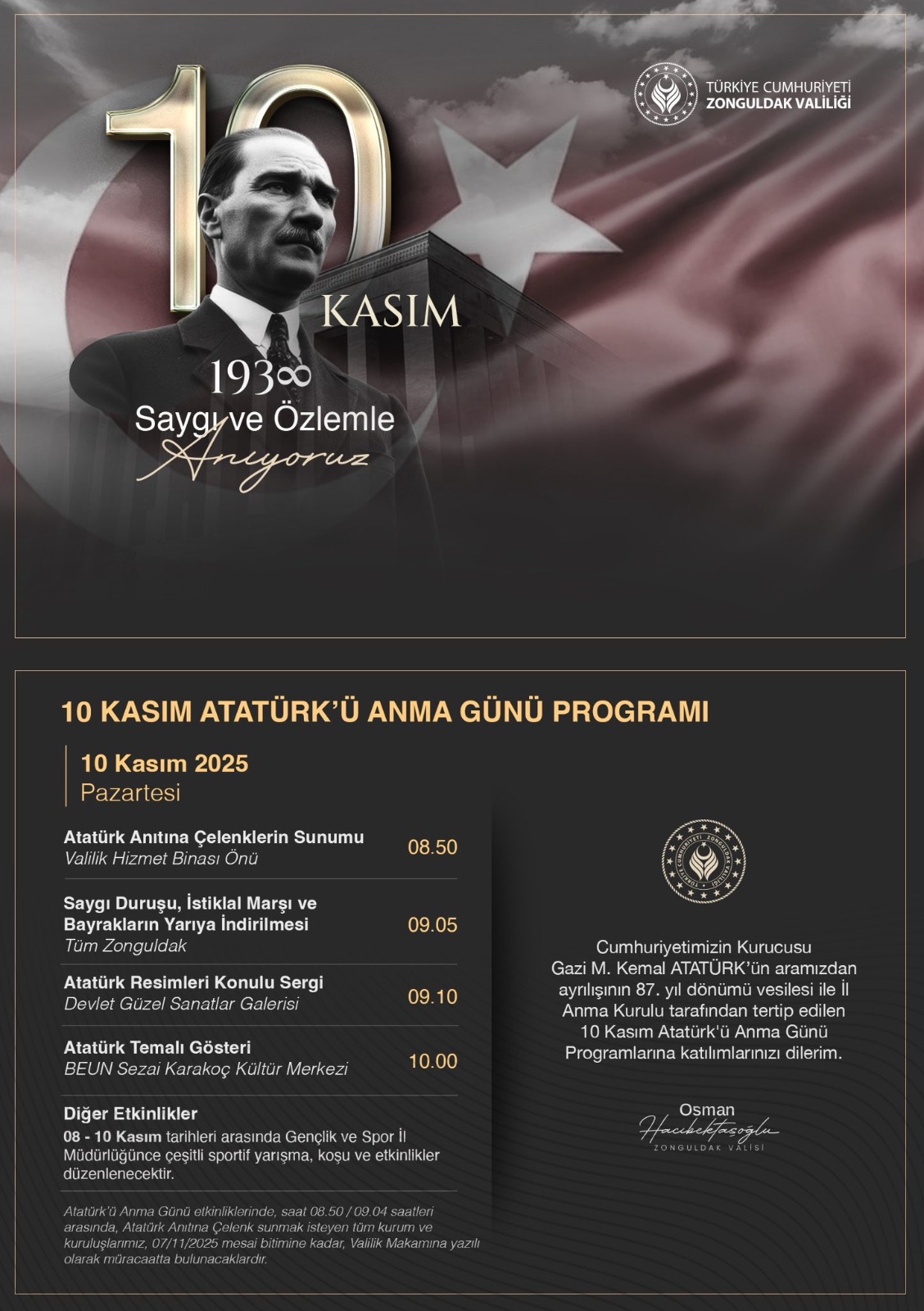 Zonguldak Valiliği, Gazi Mustafa Kemal Atatürk’ün ölümünün 87. yıl dönümü dolayısıyla 10 Kasım Pazartesi günü düzenlenecek tören ve etkinliklerin programını açıkladı.