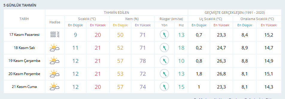 Meteoroloji Genel Müdürlüğü tarafından yapılan tahminlere göre: Ülkemiz genelinde yağış beklenmiyor. Sabah ve gece saatlerinde Trakya, İç Ege, Akdeniz’in iç kesimleri, İç Anadolu'nun güney ve doğusu, Karadeniz'in iç kesimleri, Doğu Anadolu ile Güneydoğu Anadolu'nun kuzeyinde pus ve yer yer sis bekleniyor.