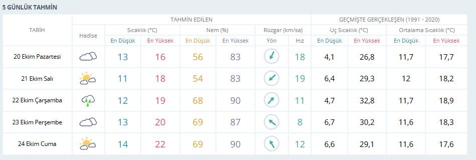 Meteoroloji Genel Müdürlüğü tarafından yapılan tahminlere göre: Ülkemiz genelinin parçalı, yer yer çok bulutlu, Güney Ege, Batı Akdeniz'in iç kesimleri, İç Anadolu (Eskişehir ve Karaman hariç), Batı Karadeniz'in iç kesimleri, Orta ve Doğu Karadeniz, Doğu Anadolu’nun kuzeyi ile Adana, Osmaniye, Hatay, Sinop, Bitlis, Şırnak ve Siirt çevrelerinin yağmur ve sağanak yağışlı, Doğu Karadeniz’in iç kesimlerinin yüksekleri ve Doğu Anadolu’nun kuzeydoğusunun yükseklerinin karla karışık yağmur ve yer yer kar yağışlı geçeceği tahmin ediliyor.