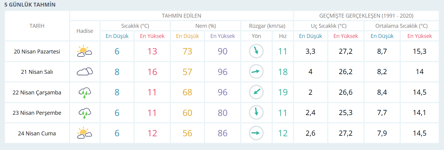 Meteoroloji Genel Müdürlüğü tarafından yapılan son değerlendirmelere göre: Ülkemiz genelinin parçalı ve çok bulutlu, Doğu Akdeniz'in kuzey ve doğusu, Doğu Karadeniz, Doğu ve Güneydoğu Anadolu ile Ordu çevrelerinin aralıklı yağmur ve sağanak; Doğu Akdeniz ile Güneydoğu Anadolu sağanak ve gök gürültülü sağanak yağışlı, Doğu Karadeniz’in iç kesimlerinin yüksekleri ile Doğu Anadolu’nun kuzeydoğusunun yüksek kesimlerinin karla karışık yağmur ve kar yağışlı geçeceği tahmin ediliyor.