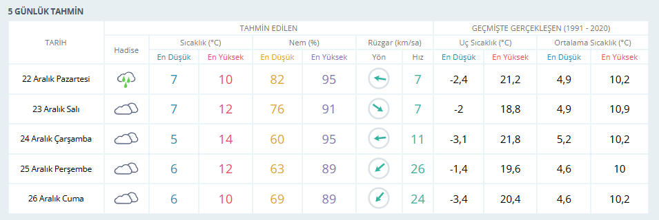 Meteoroloji Genel Müdürlüğü tarafından yapılan tahminlere göre: Ülkemiz genelinin parçalı, yer yer çok bulutlu, Güney ve İç Ege, Batı Akdeniz, İç Anadolu, Batı ve Orta Karadeniz ile İstanbul, Kocaeli, Sakarya, Bilecik, Kırklareli'nin kıyı kesimleri ve Balıkesir'in kuzey kesimlerinin aralıklı yağışlı geçeceği tahmin ediliyor. Yağışların, genellikle yağmur ve sağanak, Batı Akdeniz ile Güney Ege kıyılarında yer yer gök gürültülü sağanak, Batı ve Orta Karadeniz’in iç kesimlerinin yüksekleri, İç Anadolu'nun kuzey ve doğusunun yükseklerinde karla karışık yağmur ve yer yer kar şeklinde olması bekleniyor.
