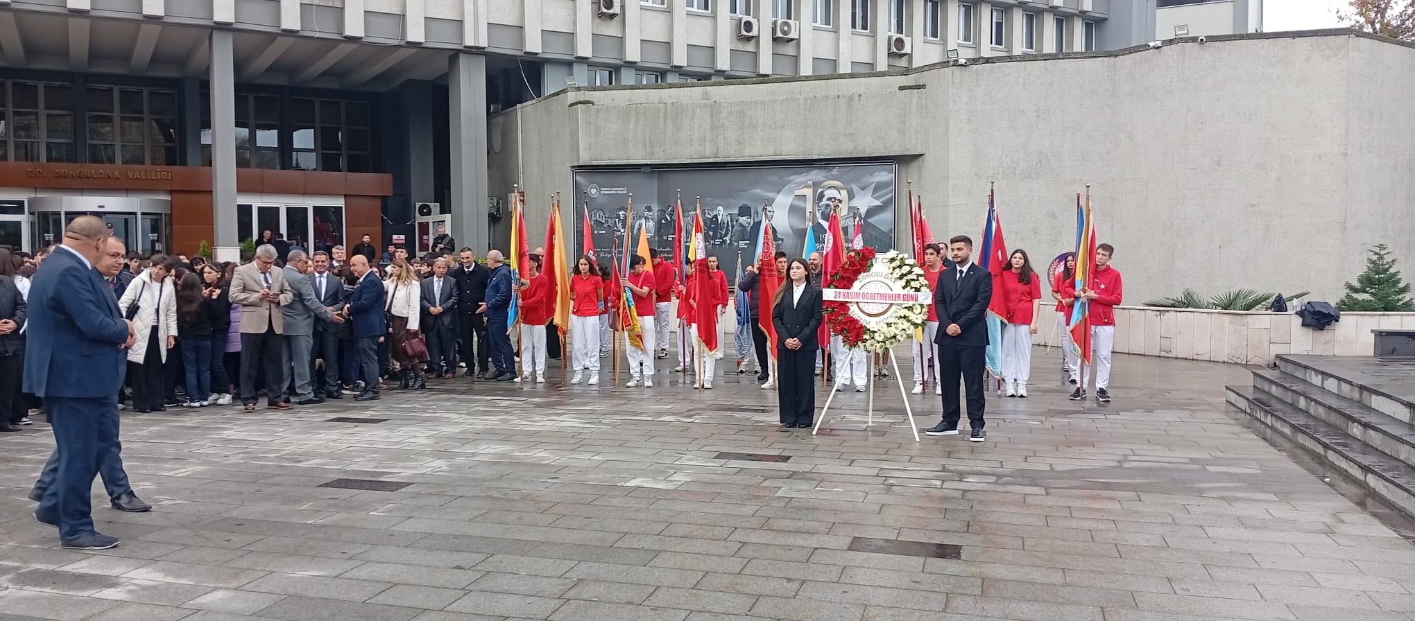 Zonguldak’ta 24 Kasım Öğretmenler Günü kapsamında düzenlenen resmi tören, bu yıl da büyük bir coşku ve saygı atmosferi içinde gerçekleştirildi. İl Milli Eğitim Müdürü Uygar Keskin başkanlığındaki Milli Eğitim camiası, sabah saatlerinde Valilik binası önünde bir araya gelerek Atatürk Anıtı’na çelenk sundu. Törene; İl Milli Eğitim Müdürü Uygar Keskin, CHP Zonguldak İl Başkanı Devrim Dural, CHP İl Kadın Kolları Başkanı Nazan Pulat, okul müdürleri, öğretmenler ve öğrenciler katılım sağladı. Saygı duruşu ve İstiklal Marşı’nın okunmasının ardından İl Milli Eğitim Müdürü Uygar Keskin, Milli Eğitim camiası adına Atatürk Anıtı’na çelenk bıraktı. Çelenk sunumunun ardından alanda kısa bir program düzenlendi.