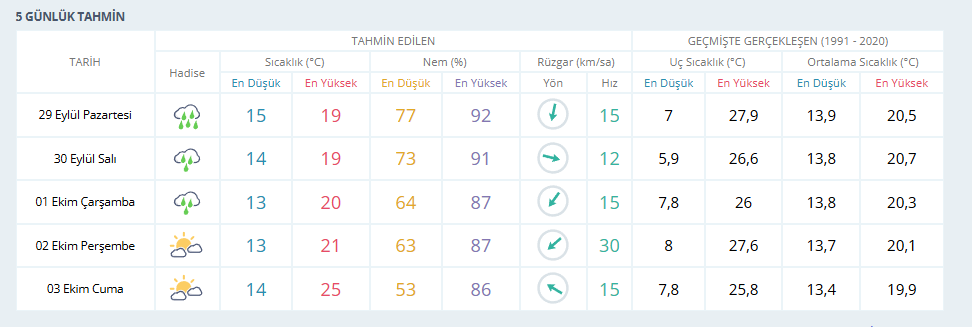 Meteoroloji Genel Müdürlüğü tarafından yapılan tahminlere göre: Ülkemizin kuzey, iç ve batı kesimlerinin parçalı, yer yer çok bulutlu, Marmara (Edirne dışında), Ege, Batı Akdeniz, İç Anadolu’nun kuzeybatısı, Batı ve Orta Karadeniz, Doğu Karadeniz kıyıları, Adana, Osmaniye, Konya, Aksaray, Nevşehir, Yozgat çevreleri ile Hatay'ın kıyı kesimlerinin sağanak ve yer yer gök gürültülü sağanak yağışlı, diğer yerlerin az bulutlu ve açık geçeceği tahmin ediliyor. Yağışların, Marmara’nın doğusu, Batı ve Orta Karadeniz, Aydın, Uşak, Afyonkarahisar, Kırıkkale, Nevşehir ve Yozgat çevreleri ile Çanakkale’nin doğu, İzmir ve Ankara'nın güney kesimlerinde yer yer kuvvetli olması bekleniyor.