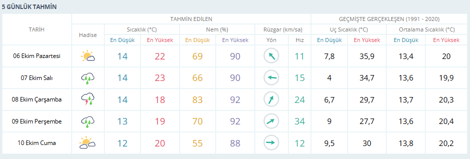 Meteoroloji Genel Müdürlüğü tarafından yapılan tahminlere göre: Yurdun kuzey ve batı kesimlerinin parçalı, yer yer çok bulutlu, Marmara'nın batısı ve Kıyı Ege ile Kocaeli, Yalova ve Bursa çevrelerinin sağanak ve yer yer gökgürültülü yağışlı, diğer yerlerin az bulutlu ve açık geçeceği tahmin ediliyor. Yağışların akşam saatlerinden sonra Marmara'nın batısı ile Kuzey Ege kıyılarında yerel kuvvetli olması bekleniyor.