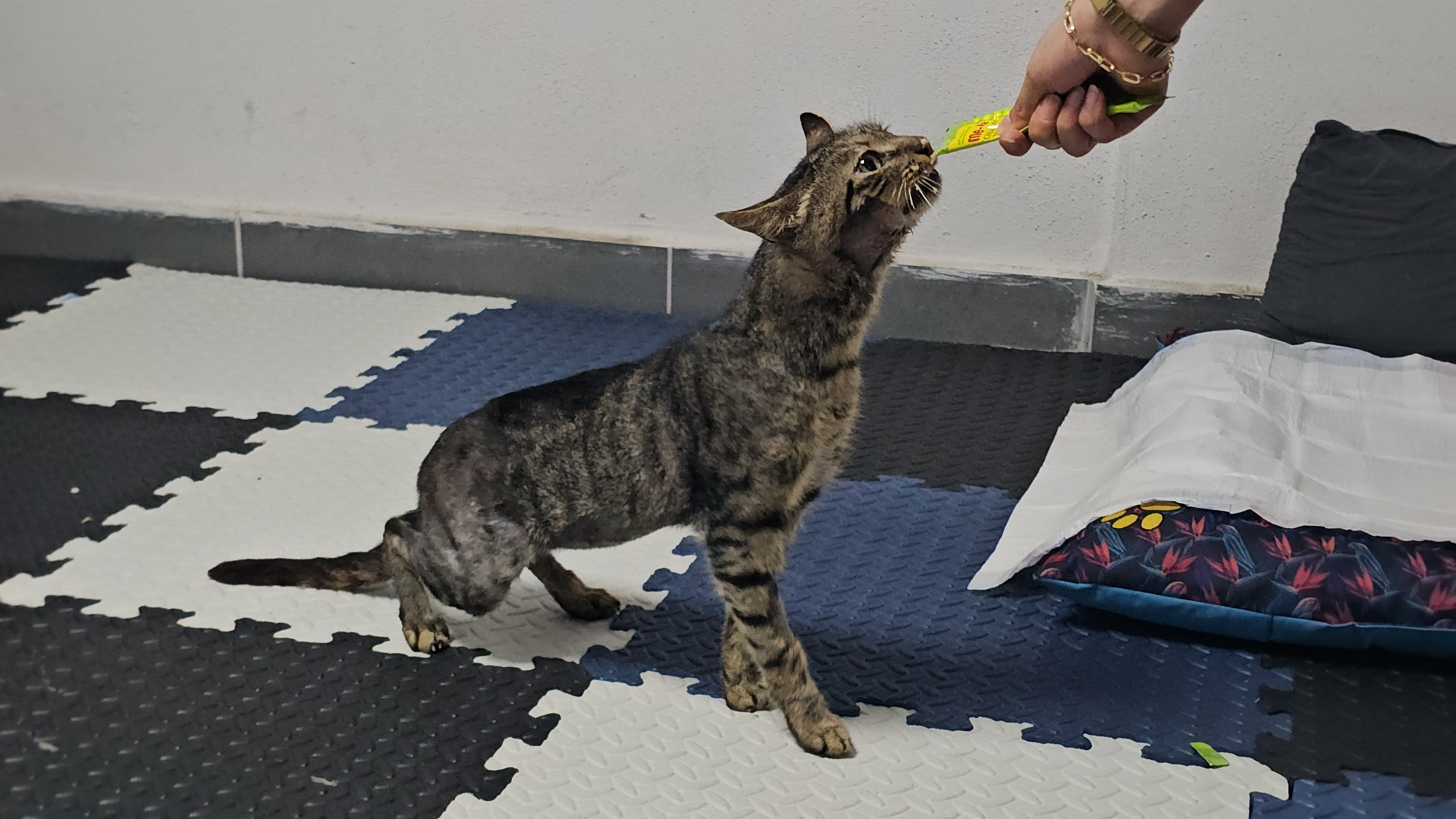 Veteriner Hekim Ömer Faruk Alkan, “Neredeyse tamamen felçliydi, yürüyemiyordu. Ayağa kalkamıyordu. Arka ayaklarını hareket ettiremiyordu. Dışkılama ve tuvalet ihtiyacını çok azını karşılayabiliyordu. İlk muayeneden sonra tomografisini çektik ve acil olarak fizik tedaviye başladık. 8 Ağustos’ta gelen kedi bugüne kadar fizik tedavi gördü. Artık ayağa kalkmaya başladı. Bu süreçte çok yorulduk, kedi de çok yoruldu. Hepimiz çok uğraştık ama günün sonunda ayağa kalktığını görünce çok mutlu olduk” dedi. Tedaviden çok teşhisin önemine dikkat çeken Alkan, “Tomografiyle 3 boyutlu incelediğimizde omurgadaki kırığın spinal kora sadece baskı yaptığını gördük. Operatif yaklaşımın riskli olduğunu düşündük ve doğrudan fizik tedaviye başladık. Kediye yürümeyi tekrar öğretmek gerekti. Her gün 2-2,5 saat tedavi uyguladık. İki kişi kediye yürümeyi öğretmeye çalıştı. Lazer terapiyle ödemi azalttık, siniri rahatlattık, magnetoterapiyle iyileşmeyi hızlandırdık, tens ile kasları uyardık” diye konuştu.