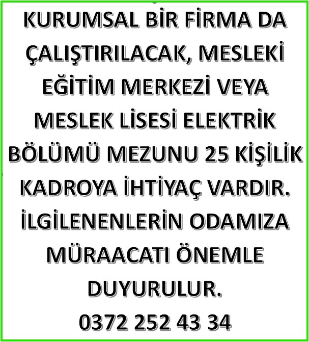 Zonguldak Elektrikçiler Odası, kurumsal bir firmada çalıştırılacak Mesleki Eğitim Merkezi ya da Meslek Lisesi Elektrik Bölümü mezunu olan 25 kişilik kadroya ihtiyaç olduğunu duyurdu.