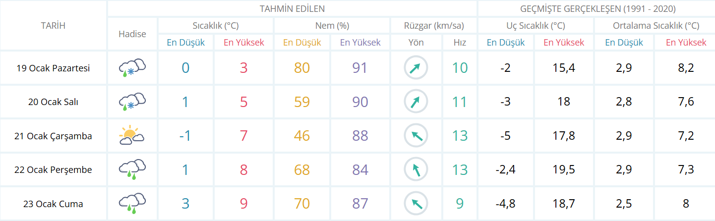 Salı günü karla karışık yağmur beklenirken, Çarşamba günü hava açacak ve güneş yüzünü gösterecek. Perşembe ve Cuma günleri ise yağmurlu geçecek.