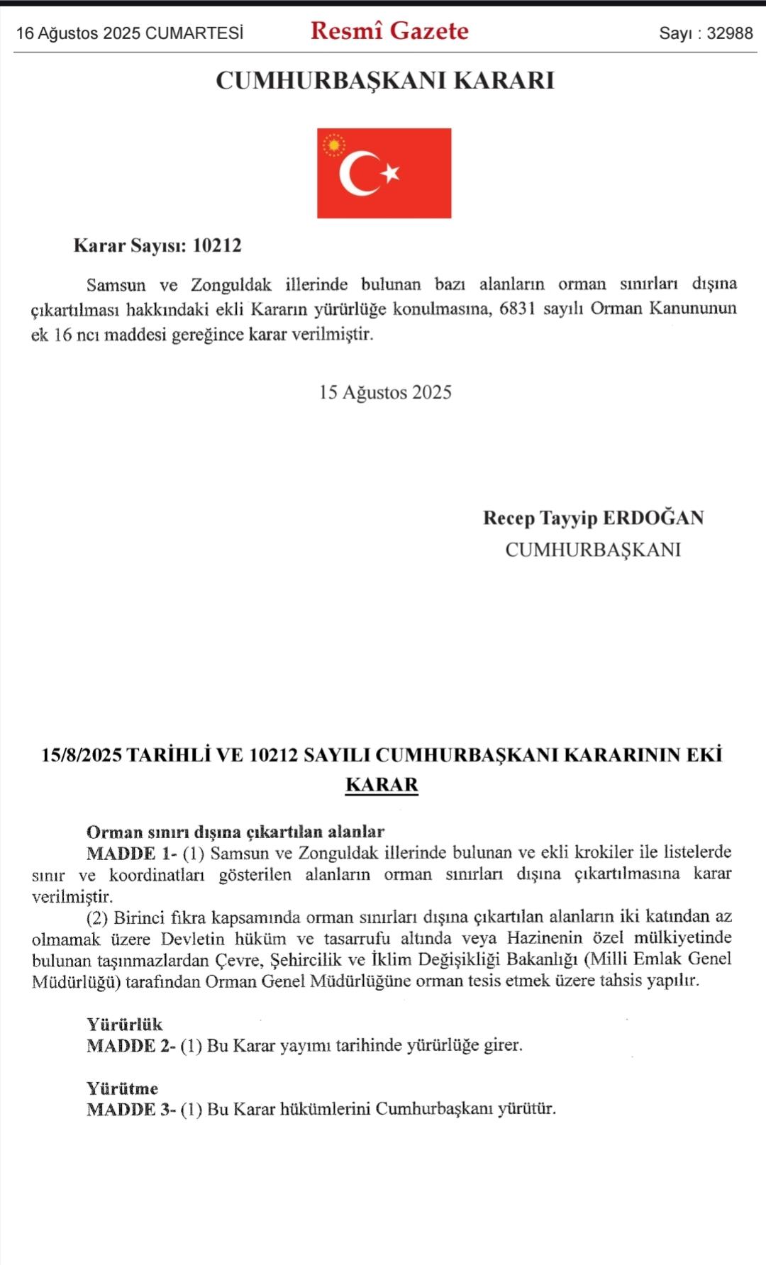 Zonguldak’ın Devrek İlçesi’nde bazı orman alanları sınır dışına çıkarıldı. Cumhurbaşkanı Recep Tayyip Erdoğan’ın imzasıyla yayımlanan karar Resmî Gazete’de yürürlüğe girdi.