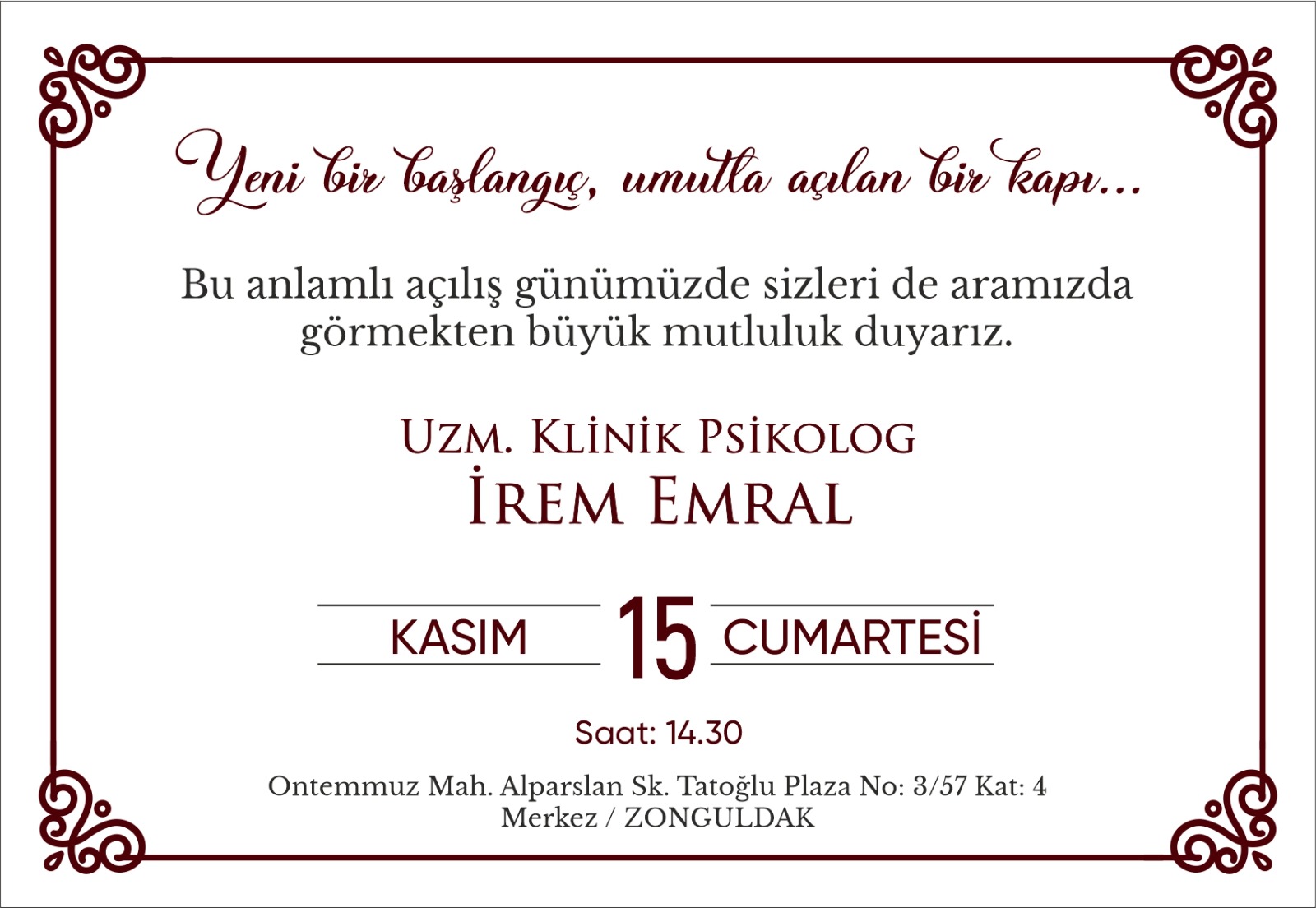 Zonguldak’ta Uzm. Klinik Psikolog İrem Emral, 15 Kasım Cumartesi günü saat 14.30’da Ontemmuz Mahallesi’nde Tatoğlu Plaza’da kendi kliniğini açacak.