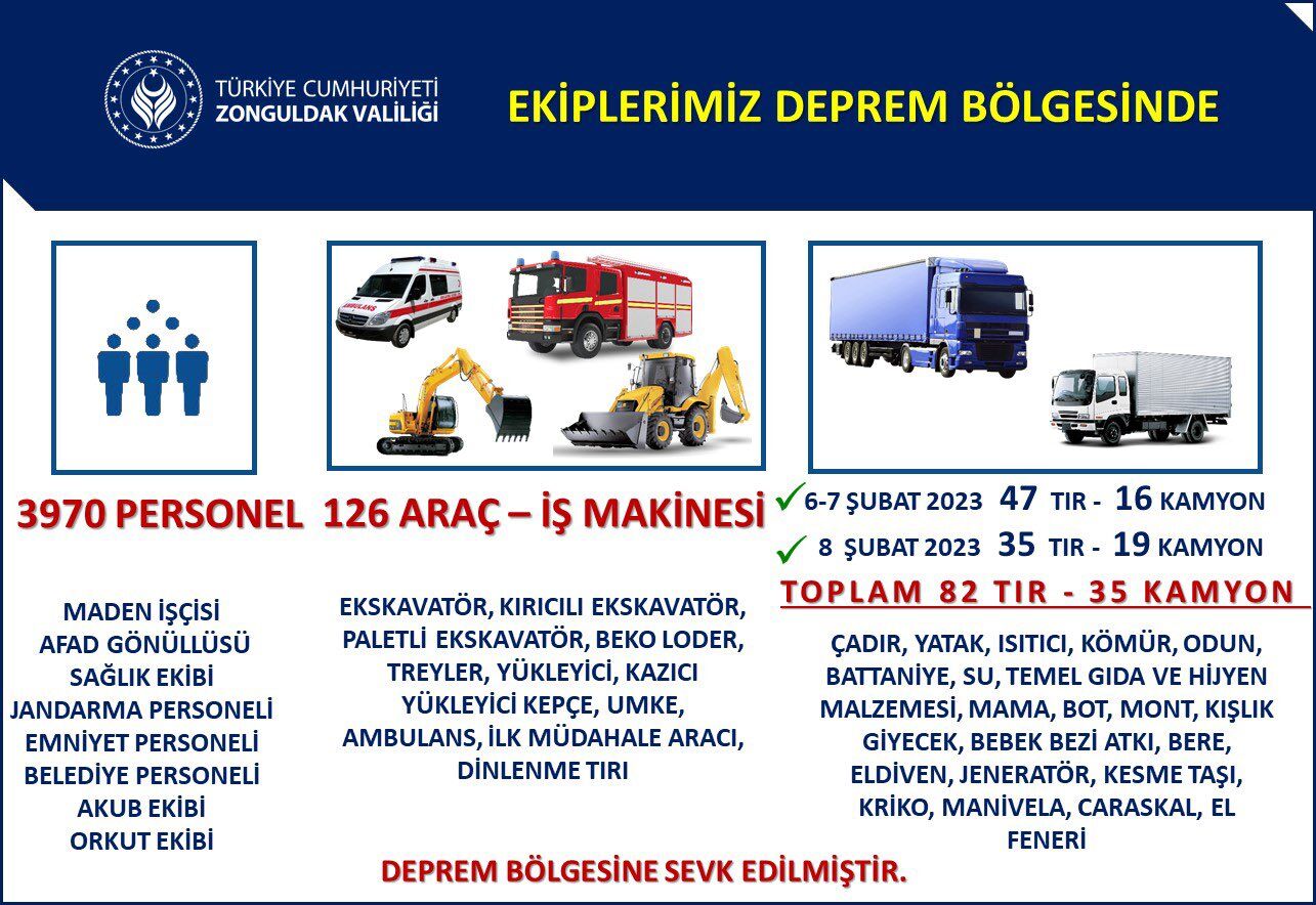 Zonguldak Valiliği 3 gün boyunca Zonguldak’tan kaç ekip kaç araç ve ne kadar yardım gönderildiğini de açıkladı.
