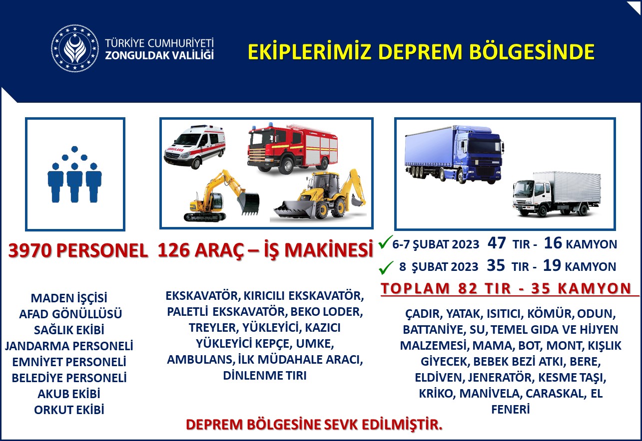 Zonguldak Valiliği tarafından yapılan açıklamada bölgeye sevk edilen 126 araç – iş makinesi, 3970 personel, 82 TIR, 35 kamyon ve gıda başta olmak üzere birçok yardım sevk edildi.